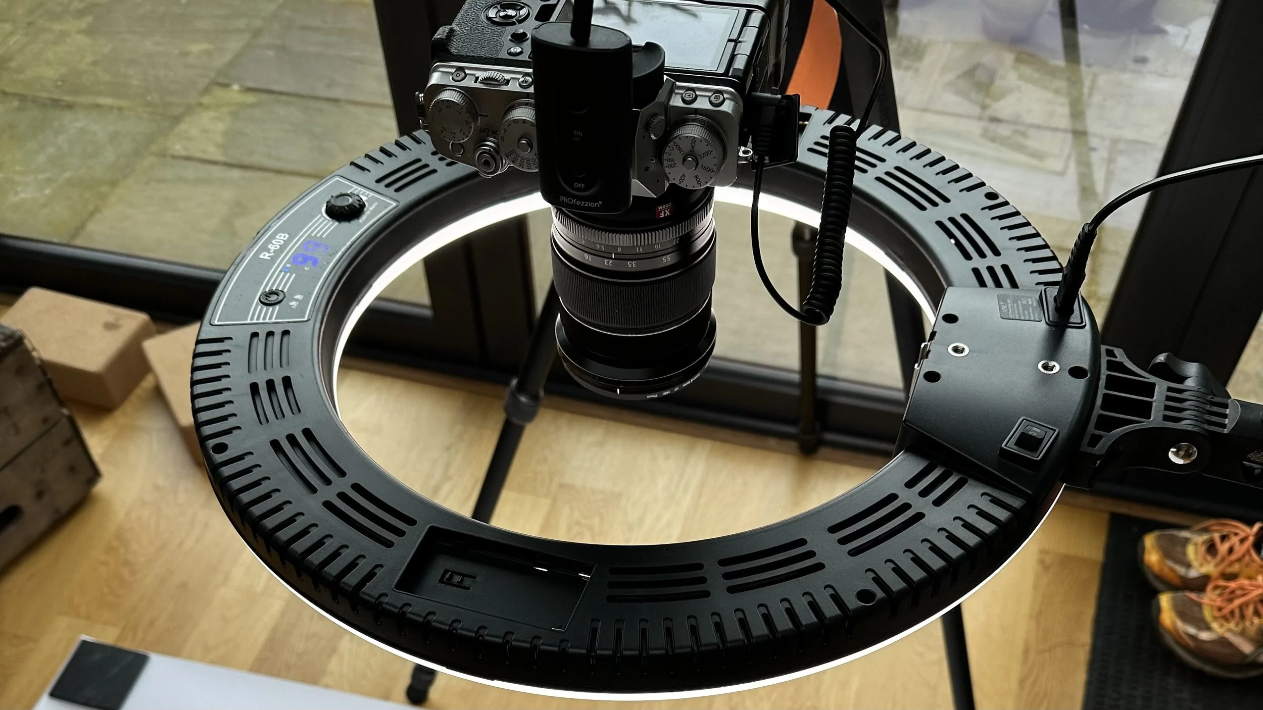 My next setup used a ring light with the camera mounted in the centre. In portraits, this would produce an evenly lit central subject with an evenly distributed shadow around the edges so I hoped it would do the same for an object.