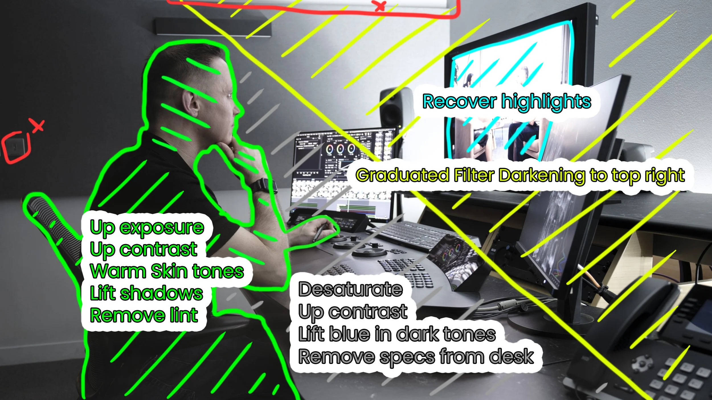 Annotated markup of colour grade and cleanup