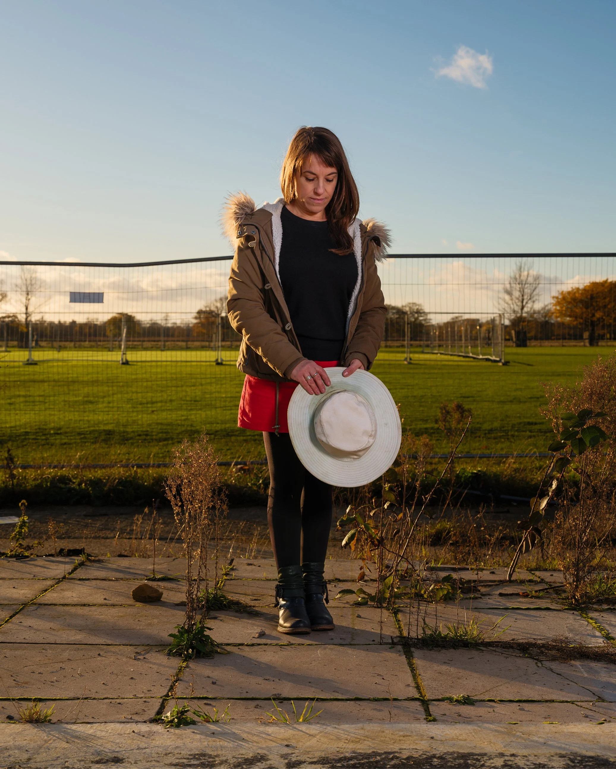 In Autumn 2023, the cricket club burnt down, and now all that remains is the concrete slab it once stood upon. A tear in the fabric of the community as a whole was a very personal loss for Emma. It was through contemplating this new absence and what it might mean that led her to ask me to take her portrait here. To commemorate Tom and their link to the club, the quiet strength we draw on in grief to accept the reality of change, and the foundations of the new life we’re building together.